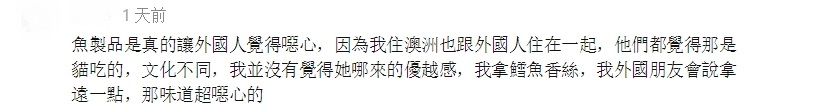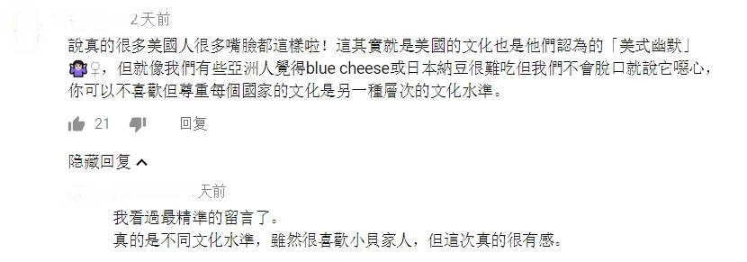 事後小貝有出來解釋他的二姊本身就是挑食的人,而誇張的反應是屬於「美式幽默」的一種,請網友們不要太在意,有人也推測外國人比較無法接受魚製食品,才會覺得噁心。但也有網友仍對二姊的反應感到不喜,指出這是美國人的「文化優越感」,認為即使不喜歡也不應該用激烈的詞語批評別人的食物「噁心」。