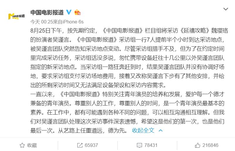 根據節目中國電影發文顯示,歡娛影視不僅更改採訪地點,更壓縮採訪時間。雙方早前就約定好吳謹言25日的專訪行程,團隊共7人也提前30分鐘抵達指定採訪處,不過卻臨時更換地點,但為了能夠及時且完整的採訪吳謹言,團隊表示「匆忙攜帶設備趕往十公里外的指定地點」,但採訪地點根本沒有事先租借,竟「要求採訪組織支付採訪場地費用」,接著吳謹言團隊又以「吳謹言下步有其他行程安排」,給予的採訪時間扣掉架設設備根本無法完整訪問。