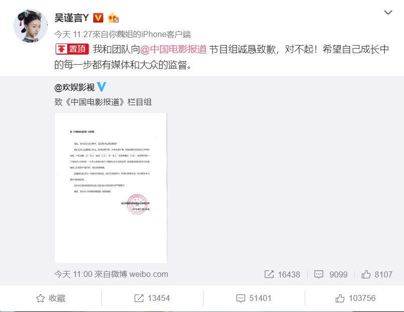 爾後,吳謹言也親自道歉,並立即分享了公司歡娛影視的道歉聲明。她配文到「我和團隊向『中國電影報導節目組』誠懇致歉,對不起!」更誠惶誠恐地表示「希望自己成長中的每一步都有媒體和大眾的監督」。