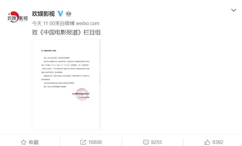突然收到指控的歡娛影視也即刻轉分享該節目文章,同時公開道歉,並決定檢討內部人員疏失,深怕得罪媒體。今天(28日)接近中午時,歡娛影視在微博公開發表「道歉聲明」,內容首先點名公司內部在藝人工作安排和工作人員協調有疏失,接著嚴正表示公司力求樹立「把『藝人』變成『仁義』,把『名人』變成厚重的『人名』」的想法,最後歡娛影視深深致歉,並且謙虛表示會加強學習。