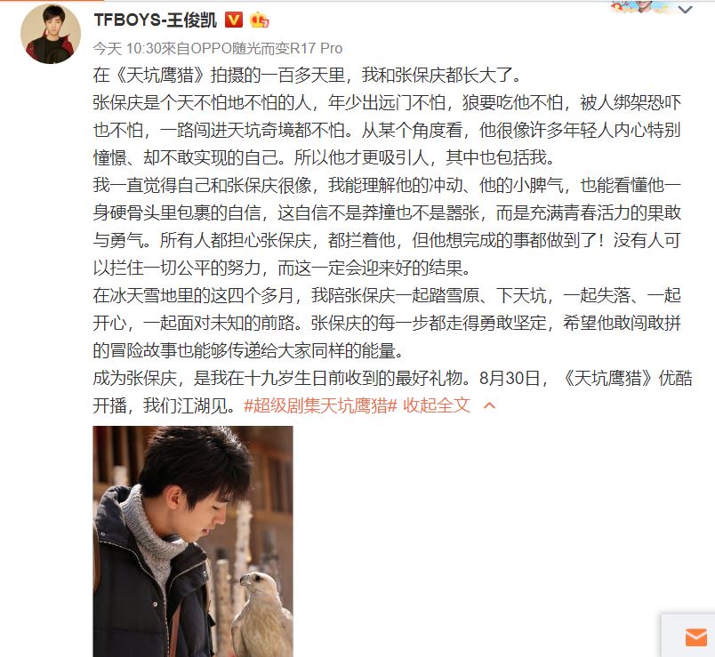 天坑鷹獵作為王俊凱成年後的首部電視劇,今日他也在微博感性發文,認為張保慶和自己都是內心有夢並渴望自我實現的少年。貼文顯示,他羨慕也覺得張保慶勇敢追夢的性格完全反映現在的自己,「像許多年輕人憧憬的自己」;而此次劇組也移至冰天雪地的長白山錄製,王俊凱也表示經歷100多天的拍攝,他彷彿和張保慶一起成長了。