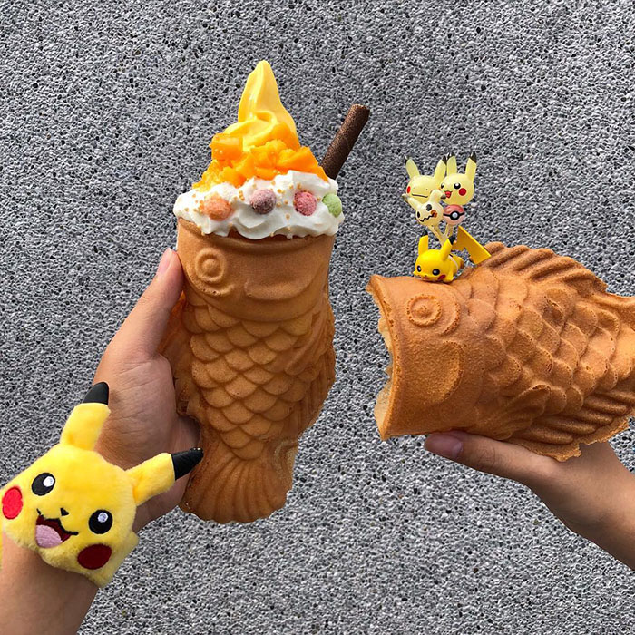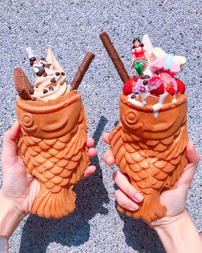 好吃好拿好拍照的鯛魚燒霜淇淋最近也席捲了IG美食圈,張大嘴的鯉魚嘴裡塞滿冰淇淋和配料,看起來超可愛!吃到尾巴的時候還會有卡士達醬,絕對不會有空虛的感覺喔!
