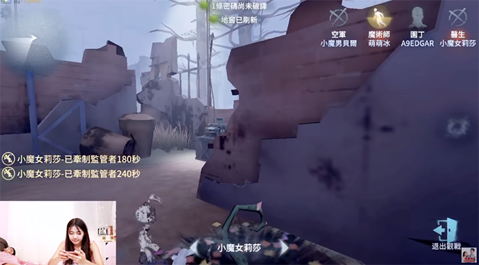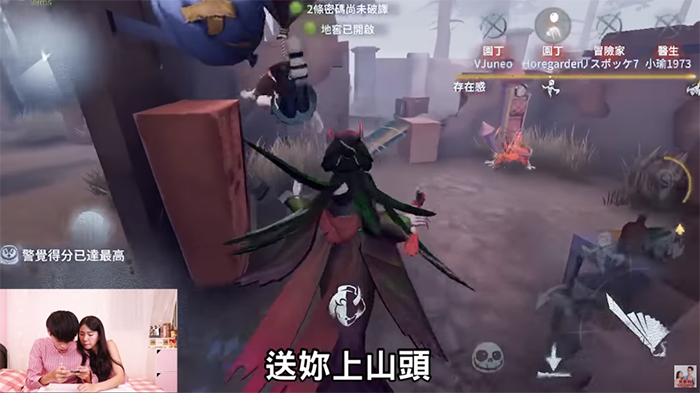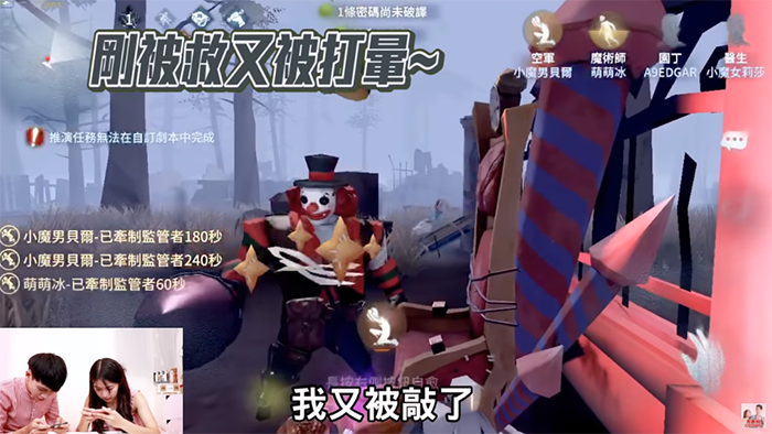 昨眾量級也發布玩第五人格的影片,更表示要挑戰兩個任務,也就是遛鬼3分鐘跟用紅蝶7分鐘淘汰所有求生者。可以發現Andy和家寧使用的帳號叫做「小魔男貝爾」、「小魔女莉莎」,而他們也各自遛鬼,也就是牽制監管者240秒,可惜兩人雖然成功達成挑戰,後來卻都被監管者淘汰了。