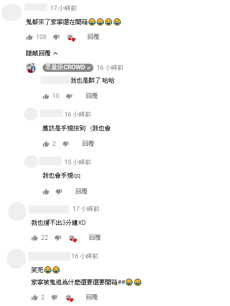 後來Andy第二個任務「七分鐘淘汰所有求生者」也順利達成,相當厲害。不過影片發布之後,因為家寧的開箱舉動也讓不少粉絲留言:「鬼都來了家寧還在開箱」、「家寧被鬼追為什麼還要開箱」,不過也有粉絲搞笑緩頰表示家寧應該只是手殘按到,Andy也幽默回覆:「我也是醉了,哈哈」。