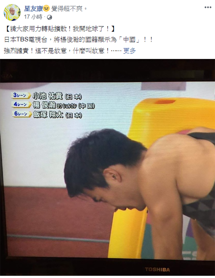 原籍日本長期定居台灣的星友康,現已歸為台灣人,平時就相當關心台灣自主權,沒想到昨天在看日本TBS轉播亞運楊俊瀚賽事時,發現楊俊瀚竟然被寫成是「中國」籍,在臉書上譴責電視台不合理的行為:【請大家用力轉貼擴散!我開地球了!】,「日本TBS電視台,將楊俊瀚的國籍顯示為「中國」!!強烈譴責!這不是故意,什麼叫故意!」