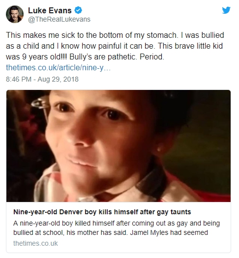 這則悲傷的新聞也讓同樣身為男同志的路克伊凡斯感到相當氣憤,在推特寫下:「這讓我感到無比噁心,我小時候也曾被霸凌過,我知道這有多麼痛苦。這位勇敢的孩子才 9 歲!霸凌者很可悲。」許多網友也在路克伊凡斯的發聲之下分享自己在求學階段被欺凌的經驗,這告訴我們無論如何都要努力向周遭的人伸出援手,傳遞愛。