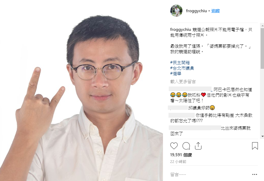 呱吉昨日也在公開競選公報照片,有趣的是他比著搖滾的手勢,他也搞笑表示自己的競選助理看了便說:「婆媽票都要掉光了」,不改幽默性格也笑壞粉絲。