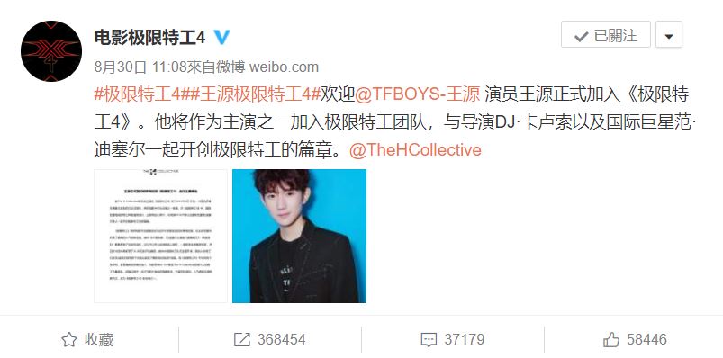 好萊塢硬漢影星馮迪索的動作強片《限制級戰警》終於要在2019年推出第4集了,總算讓喜愛刺激打鬥戲碼的影迷盼到這一天。過去,限制級戰警的演員陣容就十分強大,都是來自四海各地的演藝圈紅人,30日,根據限制級戰警微博官網指出,第4集將找來大陸當紅新生代男團TFboys的團員王源,首次跨足海外演出就能接到好萊塢大片,大批粉絲已經開始期待。