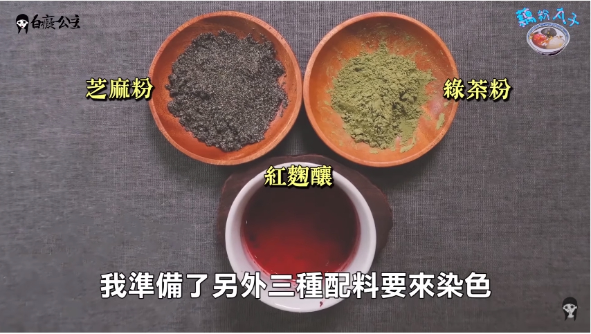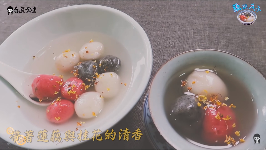 起鍋後加入自己喜歡的調味粉,白癡公主選了紅麴釀、綠茶粉和芝麻粉,讓丸子的顏色變得繽紛。最後用泡開的藕粉加入桂花、蜂蜜煮成甜湯底,便大功告成了。