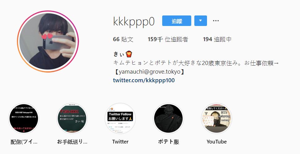 在きぃ的Instagram簡介中可以發現,他來自東京,今年才滿20歲年紀相當輕,此外他更直接透露自己非常喜歡防彈少年團的金泰亨,真的相當俏皮可愛。