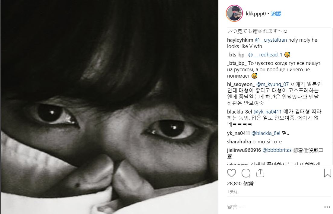 最近有一位日本網紅きぃ拍了一組只露眼睛的遮臉照,因為激似韓國當紅新生代男團「防彈少年」中的主唱「V金泰亨」而爆紅,相似程度就連防彈少年的忠實粉絲也難以分辨。