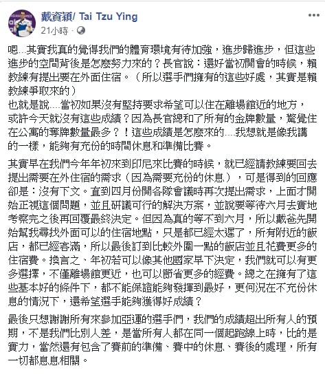 小戴寫道:「進步歸進步,但這些進步的空間背後是怎麼努力來的?長官說:還好當初開會的時候,賴教練有提出要在外面住宿。」原來早在今年年初戴資穎等中華健將就已經請教練向體育署高層提出在外住宿的需求,如此才能得到充分的休息,無奈後來得到的回應竟是「沒有下文」,直到 4 月時開各隊會議時再次提出需求,上面才開始正視這個問題,但最終還是得等到 6 月考察後才能決定。在時間緊迫下戴資穎當然沒辦法再等下去,所以只好先請父親找尋當地飯店,不料卻為時已晚,比賽會場附近的房間全都客滿,最終戴資穎就被迫花更多的住宿費,勉強住在外圍一點的飯店。