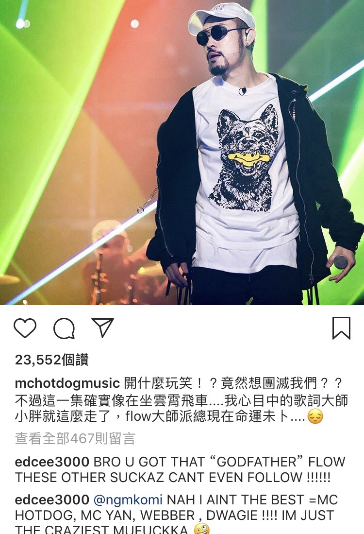 而熱狗也在Instagram上再次貼文隔空交戰吳亦凡戰隊,而饒舌歌手陳冠希竟也加入戰局。熱狗發文表示,「開什麼玩笑,竟想團滅我們!」陳冠希則在底下留言表示「你是嘻哈教父,說唱技巧不是這些傢伙可以比擬的。」充分將炮火指向自稱「young OG」的吳亦凡。