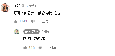 影片播出之後,滴妹則在下方留言處搞笑cue阿滴:「哥哥,你看大謙都虐待我」,不過大謙也不是省油的燈,反而直接和阿滴喊話:「阿滴快來懲罰我」,讓粉絲看見他們的對話紛紛笑翻。