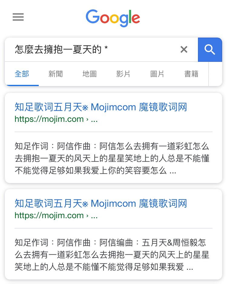 當你想要搜尋一首歌,但你忘記它全部的歌詞,你便可以搜尋「怎麼去擁抱一夏天的 * 」那麼就會出現五月天的歌《知足》!