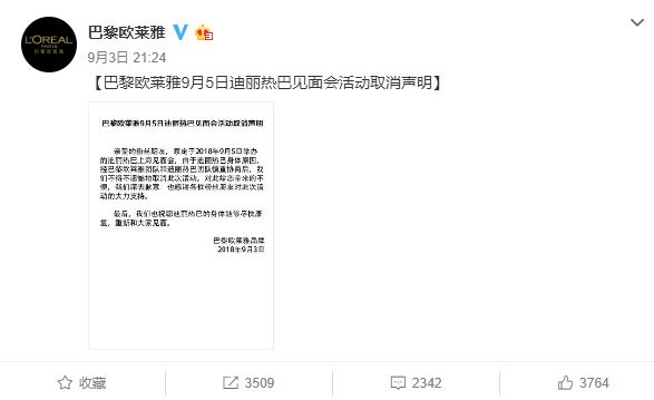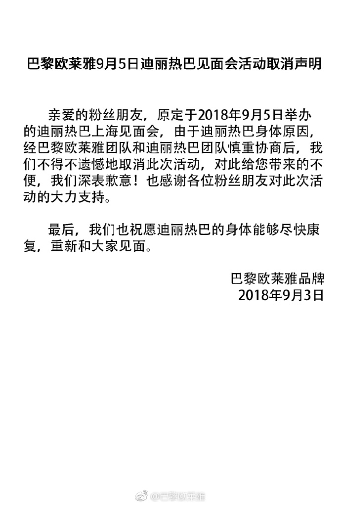 3日晚間,巴黎萊雅於官方微博發布迪麗熱巴5日於上海的見面會,因「身體原因」暫時取消。今年迪麗熱巴受邀成為巴黎萊雅品牌形象代言人,卻因身體狀況不得不取消通告,不過經紀公司未對迪麗熱巴的狀況多作解釋,讓粉絲相當擔心。