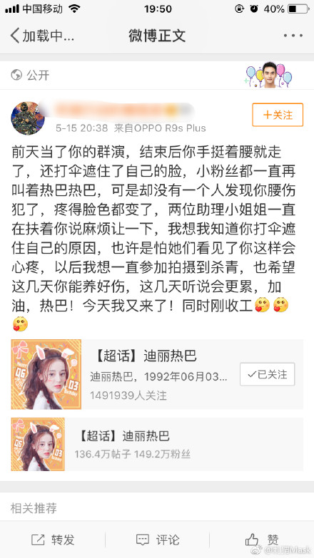 此前迪麗熱巴也因為拍戲而不斷傳出受傷噩耗。3月因演出俠女「烈火如歌」接受採訪,她透露拍戲練習「甩鞭」卻不幸抽打到臉部,讓某些畫面只好拍半邊臉,而5月再傳出,迪麗熱巴在未上映的古裝電影「日月傳奇」吊鋼絲傳出腰傷復發,一名群演看見她忍痛扶腰、臉色慘白,大批粉絲相當心疼,也呼籲經紀公司適當調配迪麗熱巴的工作量。