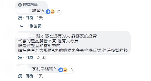 臉書久違更新後不久,立刻引來許多網友、酸民砲轟「離婚了沒?」、「亨利(小王)幸福嗎?」、「當帥哥美女真好,不管做再大的錯過都有人說加油」不過也有死忠粉出來力挺,關心她是否已經調整好心態,走出之前爭議事件造成的陰霾。