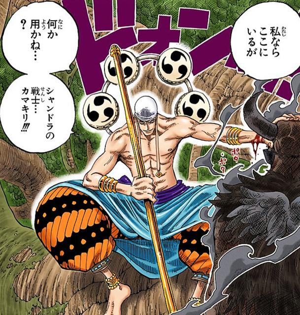 空島的神背上的 4 個太鼓可以變成雷電進行放電攻擊,還能以近光速般的方式移動,產生電能驅動機器,或藉由放電作用產生高溫。