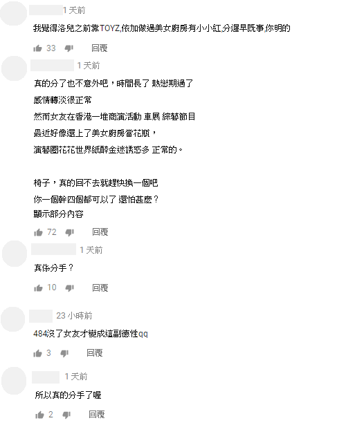 影片PO出之後立刻引起網友熱烈討論,紛紛打下:「我覺得洛兒之前靠TOYZ,做過美女廚房有小小紅,分遲早的事」、「真的分了也不意外吧,時間長了 熱戀期過了 感情轉淡很正常」、「真分手?」、「所以真的分手了喔」、「所以到底有沒有分啊」、「真的分手?」、「484沒了女友才變成這副德性qq」。