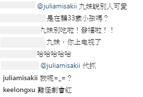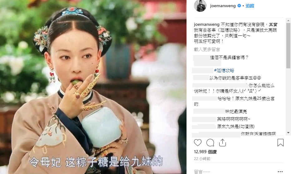 另一方面,Joeman還打上「明玉好可愛啊!」,稱讚在劇中主角「魏瓔珞」身邊的宮女「明玉」,而他此舉也引起許多粉絲急tag咪妃告狀:「九妹說別人可愛」,而咪妃也打上無言的表情並說:「我呢」,相當甜蜜!