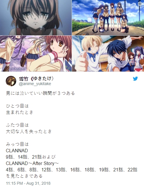 ▼推特網友以男人放聲哭泣的 3 個瞬間,包含出生、失去重要的人,最後就是觀看《CLANNAD》動畫的時候,就可以知道這部動畫在大眾的心目中有多麼感動。