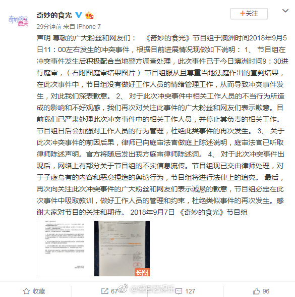 當天晚上該節目官博就立即發表道歉聲明,並表示會積極配合警方查辦。7日,節目組終於公開審判書,並表示施暴的工作人員已經遭到停工處分,再次向大眾道歉,然而外界並不領情痛批到,「丟臉丟到國外去了」、「怎麼沒向被打的受害者道歉」、「素質低下的節目別播了」。