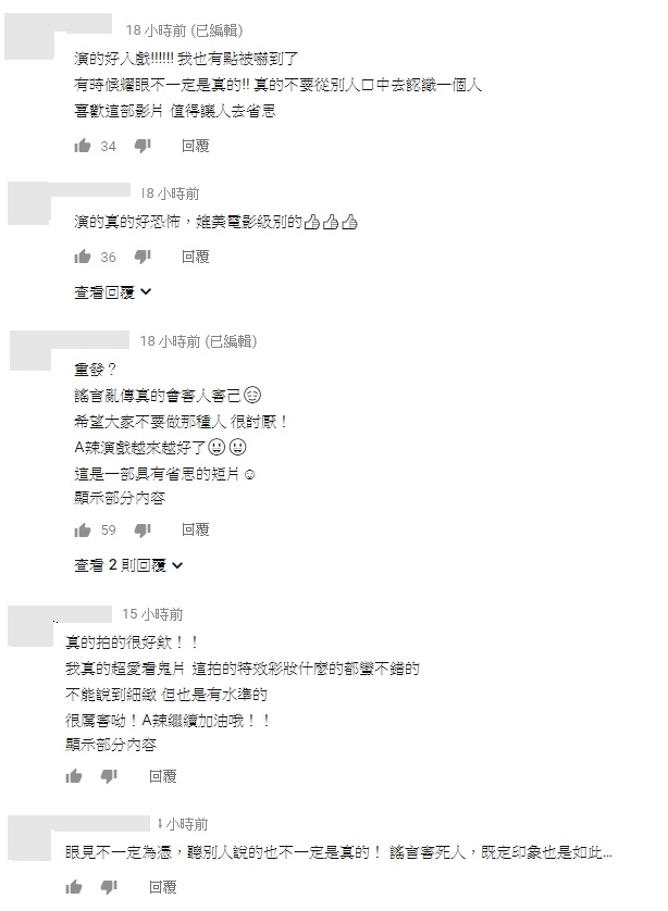 不少網友們看了以後感同身受,紛紛表示「謠言真的會害死人」、「語言霸凌真的會害死人,A辣加油」、「眼見不一定為憑,聽別人說的也不一定是真的! 謠言害死人,既定印象也是如此…」也有網友認為「演的真的好恐怖,媲美電影級別的」、「這個質感太棒了」、「拍的很好,不輸真的電影」、「好棒的質感啊!」、「好看,好逼真,有電影的質感哦!」、「拍的很好 題材很棒」大讚影片拍的超級好。