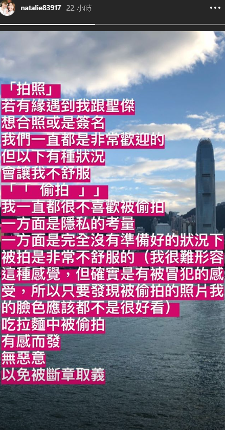 而聖嫂嘟嘟其實已有說明:「若有緣遇到我跟聖傑,想合照或是簽名,我們都是非常歡迎的」,希望粉絲可以大方和他們打招呼,不要用偷拍的方式。