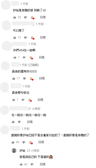 影片發布之後,許多網友紛紛留言:「許瑜是烏鴉的菜 別裝了xD」、「可以嫁了」、「最後的還有你XD」、「你們484在一起啊」、「最尾很sweet」、「騙我沒在一起」、「在一起在一起在一起在一起」,猜測兩人可能有譜,而此外也有網友留言:「感覺好像許瑜已經不是含羞草日記的了,感覺好像是烏鴉的了」,沒想到此留言竟釣出許瑜親自在下方回覆:「我是我自己的 不是誰的」。