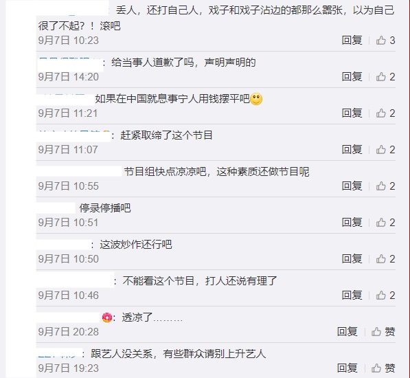 影片曝光後,網友們紛紛表示「過分了,不管怎麼樣,打一個女生真的很不厚道」、「這特麼真丟人,丟人都丟到國外去了」、「節目也停了吧,這樣的製作組能整出什麼好節目」、「妥善處理,別誤傷藝人」、「節目也別播了,播了都別看」認為節目組的處理不夠妥當,但也有網友跳出來為節目組說話認為「都說節目組,粉絲自己的剛開始行為難道就不反思嗎?」、「肯定事出必有因」、「粉絲們也收斂一點,誰都有不對」。