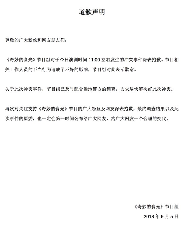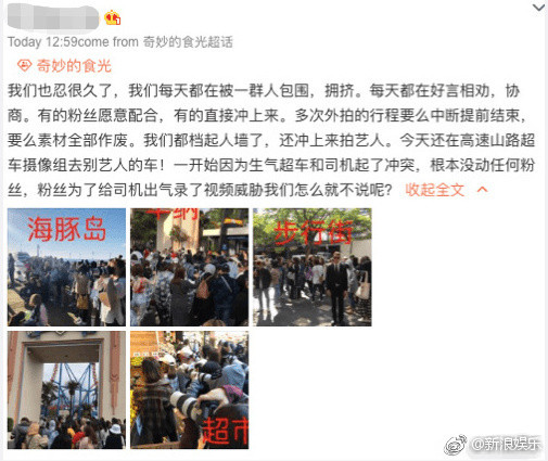 據陸媒報導,風波爆發後,也有工作人員在網路上喊冤表示「我們每天都在被一群人包圍,擁擠。每天都在好言相勸,協商。有的粉絲願意配合,有的直接衝上來。多次外拍的行程要麼中斷提前結束,要麼素材全部作廢。我們都擋起人牆了,還衝上來拍藝人。今天還在高速山路超車攝像組,去別藝人的車!」而節目《奇妙的食光》也立即發布一則抱歉聲明「節目相關工作人員的不當行為造成了不好的影響,節目組對此表示歉意。關於此次衝突事件,節目組已及時配合當地警方的調查,力求盡快解決好此次衝突。」希望能夠平息此事。