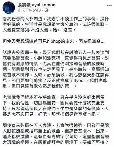 大陸嘻哈選秀節目《中國新說唱》目前正在進行六強賽,其中,歌手熱狗與張震嶽自第一季就開始擔任導師,現今更在第二季中與選手功夫胖、派克特組成戰隊,9月6日時他們發布新歌《再見hiphop》與派克特和功夫胖一起合唱,歌詞訴說他們一路走來的心路歷程,感動眾多網友,獲得一片好評。