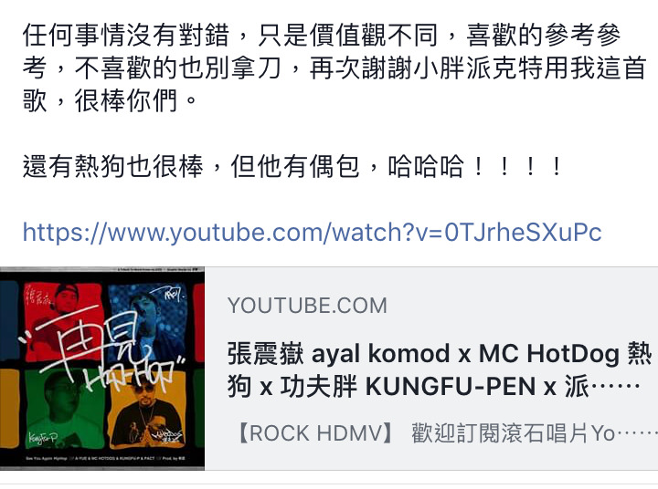 有網友更指出,這首歌應該是他們想描述自己對於《中國新說唱》及HIPHOP的看法,更大膽猜測「熱狗會不會下一季就退出了呢」。而其他網友聽了以後也紛紛留言「太讚!想說的都在歌裡了」、「好聽 嶽哥的旋律真的沒話講」、「三段都很讚 old school不滅」、「這首歌對真的愛Hiphop的人聽到會很感動吧」、「熱狗跟派克特真的很讚!」、「real hip hop直白動人又真誠,而且..還很好聽」、「這首最屌的是輕描淡寫卻能字字重擊著每個人的點!!!」、「聽完覺得好感動」、「這首真的很神! 阿嶽一開頭就讓我雞皮疙瘩了」、「不得不說這首真的屌」。