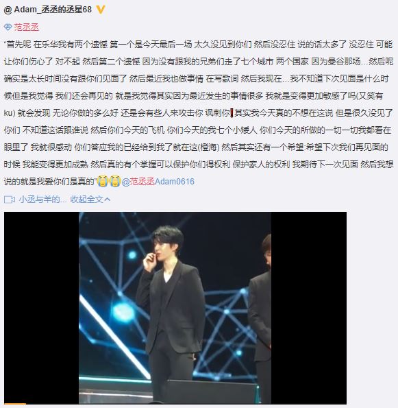 當日范丞丞在微博發文,提出兩點難過原因,包括自己日前缺席曼谷見面會,以及南京是最終巡迴場讓他感覺不捨。文中也表達近況,顯示「因為最近發生的事情很多,可能使我最近變得更加敏感了吧」,文末也承諾自己能更成熟,並表示「可以保護你們(粉絲),保護我的家人」。