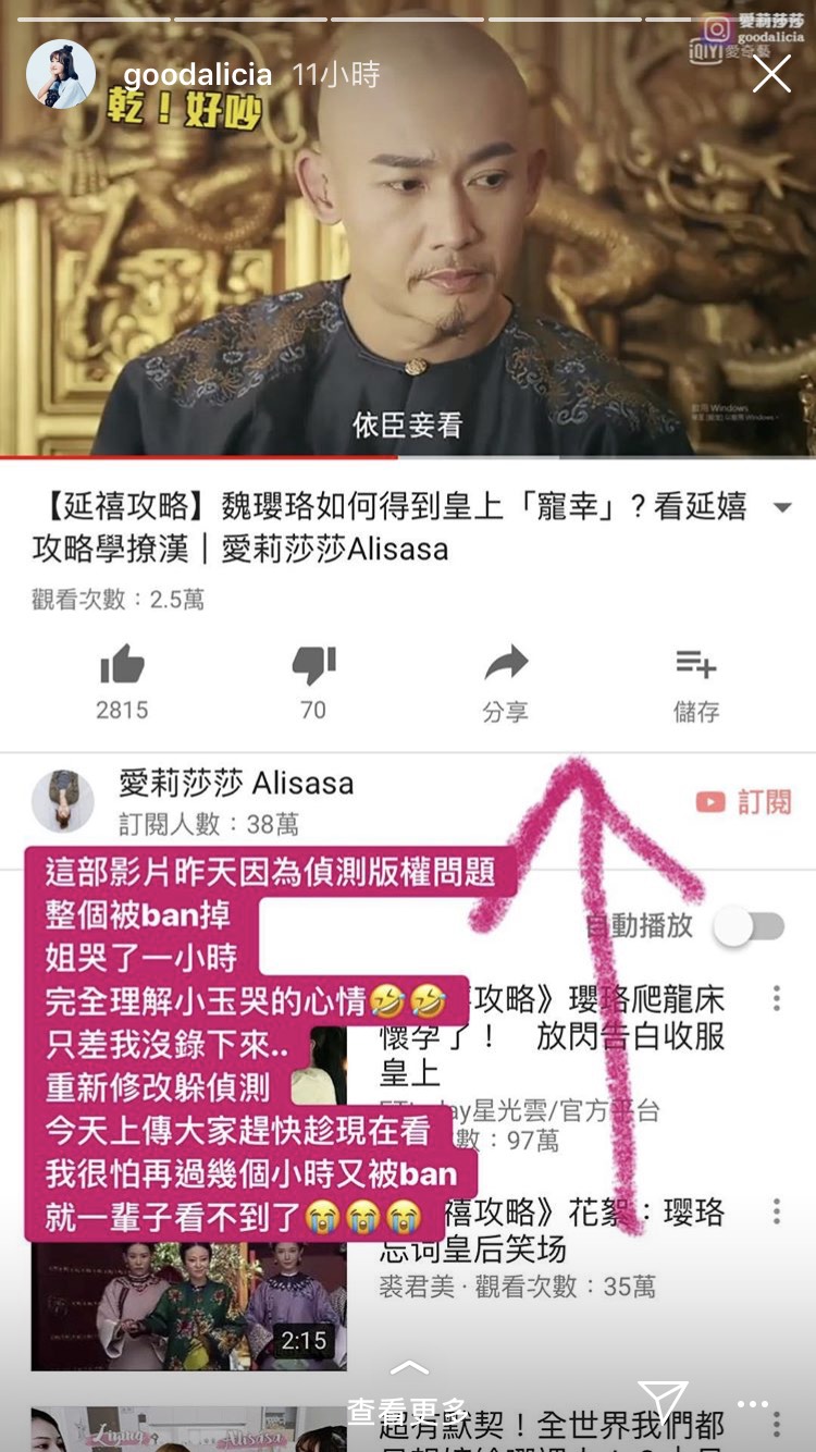 愛莉莎莎這支影片雖然是分析歸納的性質,上傳時卻因版權問題而被下架,害她忍不住委屈的哭出來,在IG上分享自己的心情,大呼「完全理解小玉的心情」,然而她依舊不放棄,重新修改一番後再次上傳,並呼籲粉絲們「趕快去看」,害怕幾個小時後又會被下架 !