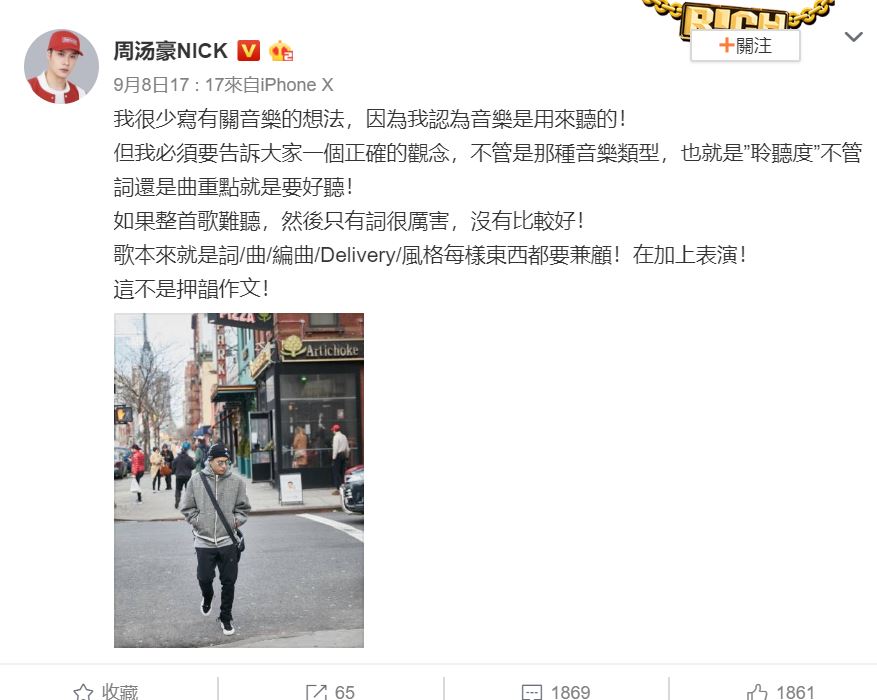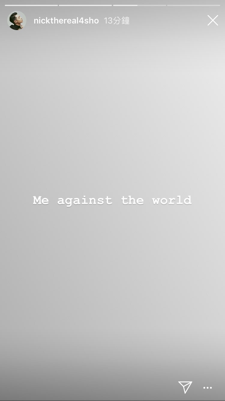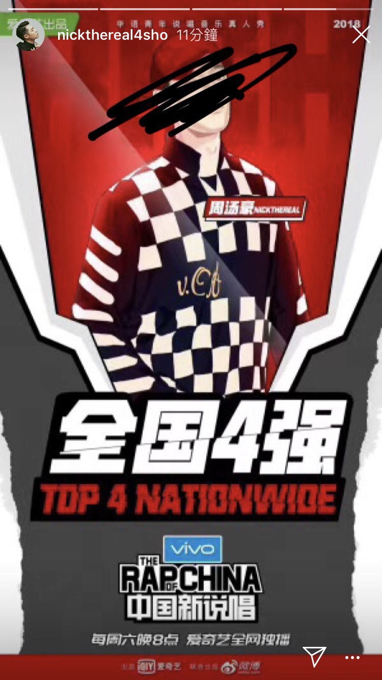 同一時間,周湯豪也在Instagram限時動態上發表同一篇文章,更留下一句「me against the world(對抗世界)」,更貼出一張新說唱四強名單海報,但卻把自己的臉後製塗黑,雖然比賽成功晉級,不過周湯豪似乎也背負不少心理壓力。