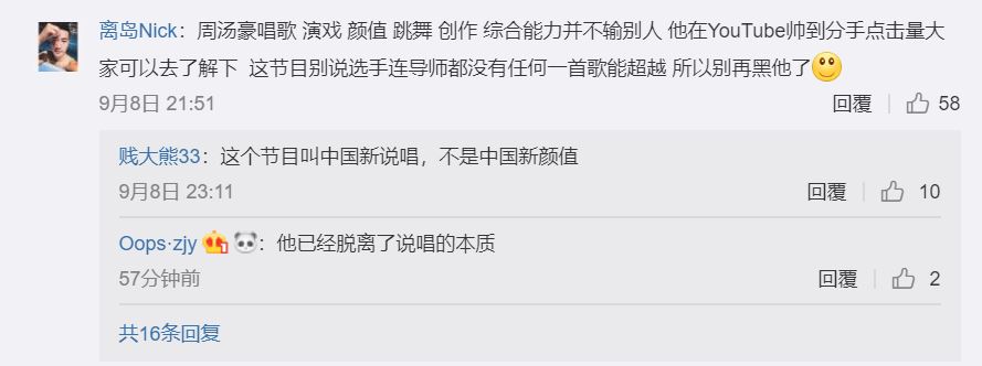 對此,網友評價兩極,有人支持認為歌曲好聽最重要,也有人堅持中國新說唱的宗旨就是以「歌詞」為本,並表示「他(周湯豪)已經脫離了說唱本質」、「這不是中國新顏值」。