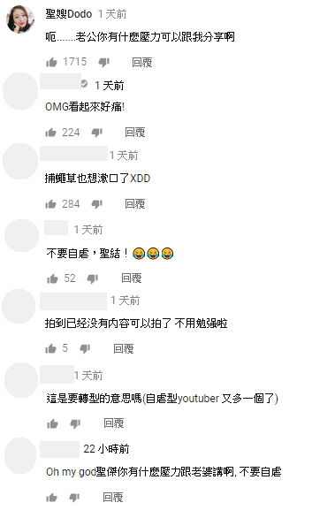 影片發布之後,因為這次的影片風格有點雷同自虐系youtuber小玉,有不少網友看見之後也紛紛留言「OMG看起來好痛!」、「我們為勝傑的舌頭默哀!!!」、「不要自虐,聖結!」、「勝傑是不是壓力太大呀!」、「捕蠅草也想漱口了XDD」、「拍到已经没有内容可以拍了 不用勉强啦」、「越來越無聊」,就連聖嫂嘟嘟看見之後也留言:「呃.......老公你有什麼壓力可以跟我分享啊」,笑翻粉絲。
