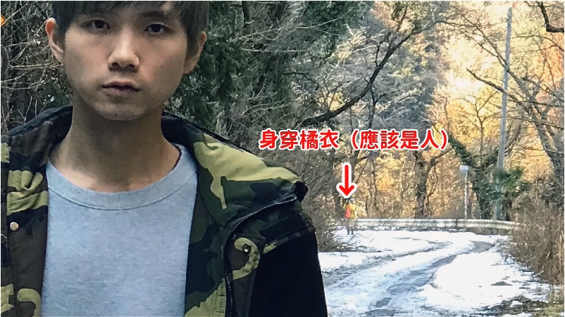 走到隧道中央時,攝影機的人臉辨識系統突然有了反應,前面明明空無一人,卻出現標示人臉的對焦框,而且由大小來看「祂」靠的非常近,讓黃氏兄弟嚇得大叫,還好有反應的地段只限於隧道中央的一個區域,其他地方並沒有異狀。事後檢查照片時兩人也發現,哲哲的背後竟出現了一個身穿橘衣的人影,然而當時除了他們以外並沒有遇到其他遊客,讓他們看的毛骨悚然。