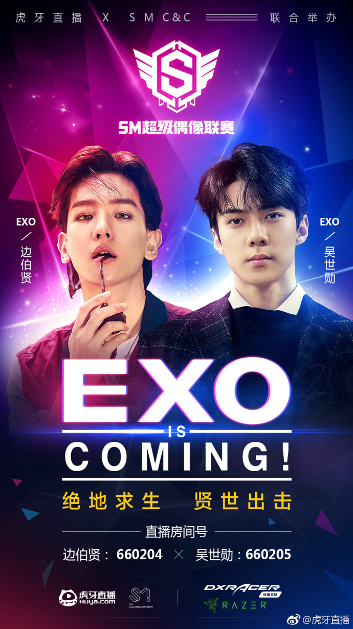 在「虎牙SM偶像聯賽」中,由虎牙派出直播主,SM娛樂公司派出明星。10日,第二期聯賽中時,由虎牙電競高手周毅聯手SM的世勳和伯賢組隊玩生存遊戲。