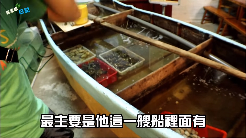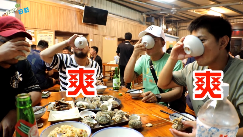 這次草爺與否希一起來到馬祖旅遊,由馬祖出身的Youtuber「周小馬」帶領,一起去吃當地的海鮮燒烤店,店門口放了一艘小漁船,其中裝著剛剛捕獲的新鮮海產,包含半個手掌大、需要用筷子才能夾出來的「蝾螺」,喝酒也不用杯子,而是用和飯碗一樣大的碗!