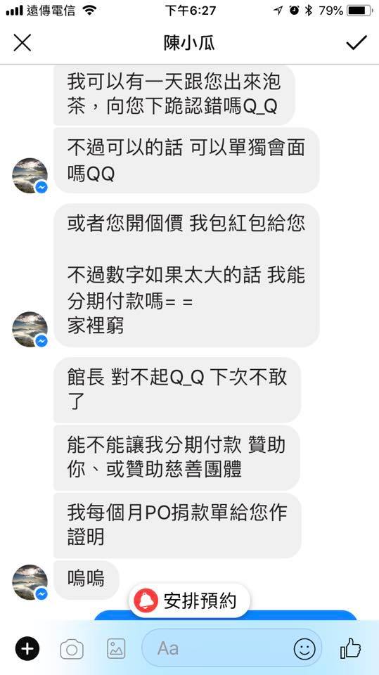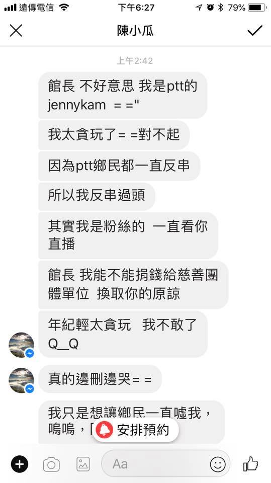 只見館長昨PO出與該鄉民的對話截圖,對話中「jennykam」頻頻道歉,更表示自己是館長粉絲,因為反串過頭才會發布那些文章,更直說「我可以有一天跟您出來泡茶,跟您下跪認錯嗎,不過可以的話,可以單獨會面嗎?或是您開個價,我包紅包給您」!不僅如此,「jennykam」也在對話中表示自己「邊哭邊刪文」。