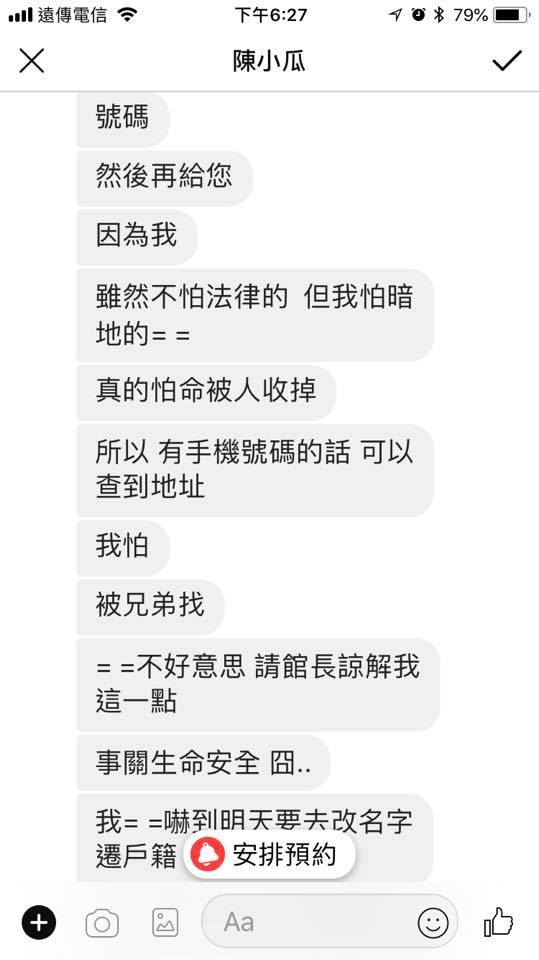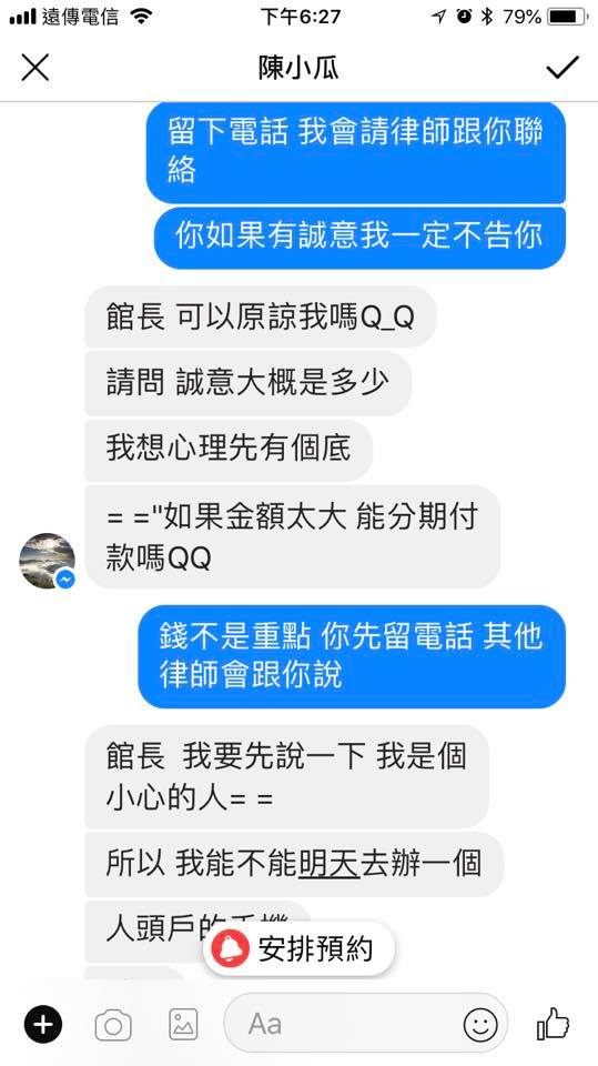 對此館長則回覆要他留下聯繫方式,也釋出善意表示「你如果有誠意我一定不告你」,怎料對方不斷推拖,一直不願意告知聯繫方式,而他還打下:「雖然我不怕法律,但我怕暗地的,真的很怕命被人收掉,有手機號碼可以查到地址,我怕被兄弟找,不好意思請館長諒解這一點,事關生命安全,我嚇到明天要去改名字遷戶籍」,對話中甚至屢屢打出顏文字,看起來相當不誠懇。