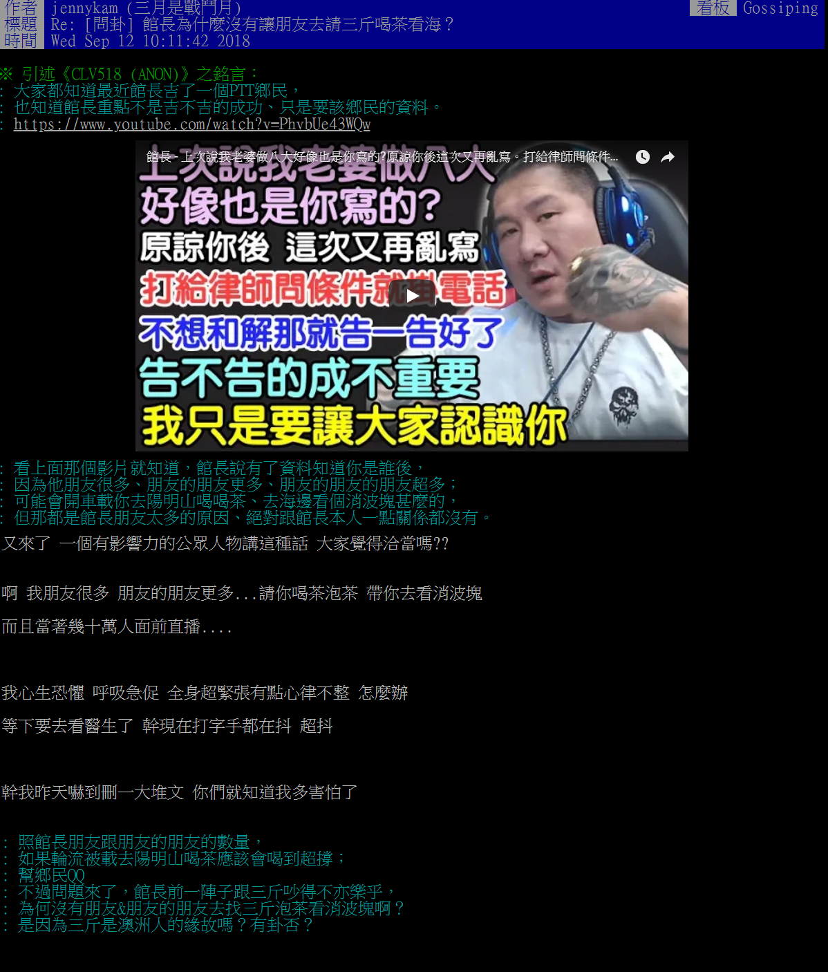 館長昨日透過臉書轉發PTT鄉民的文章,氣憤表示對於造謠者忍無可忍,並且將要提出告訴。而館長放話之後,該鄉民竟立刻於PTT大動作刪文,館長見狀也喊話:「不用刪了 都備份好了,等你出來我們一起泡茶」,此舉更讓該鄉民嚇得直道歉。事實上該鄉民「jennykam」是PTT中的名人,平時用許多帳號在八卦版發文,更時常利用時事引戰,而這次踢到鐵板,也讓他立刻向館長道歉!