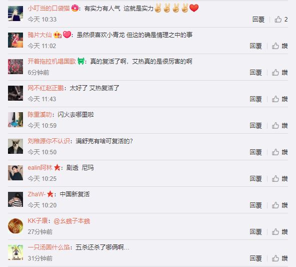 對此,不少網友都相當支持艾熱復活,並表示「確實是艾熱復活了,憋了多少大招」、「有實力有人氣」、「艾熱真的好厲害」,不過也有人替小青龍感到遺憾,去年就曾參與第一季《中國有嘻哈》的他,今年回鍋因為忘詞遭到淘汰,好不容易搶下復活名額,仍失去晉級總決賽的機會。