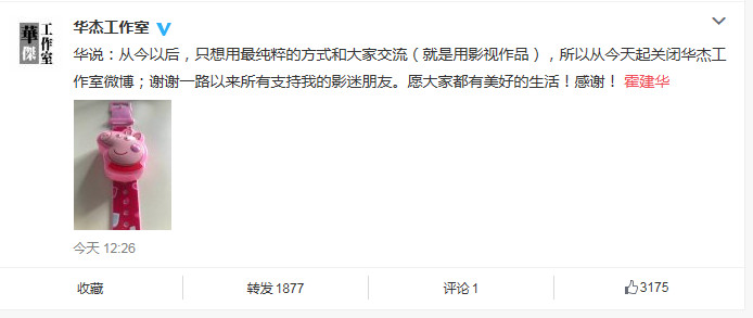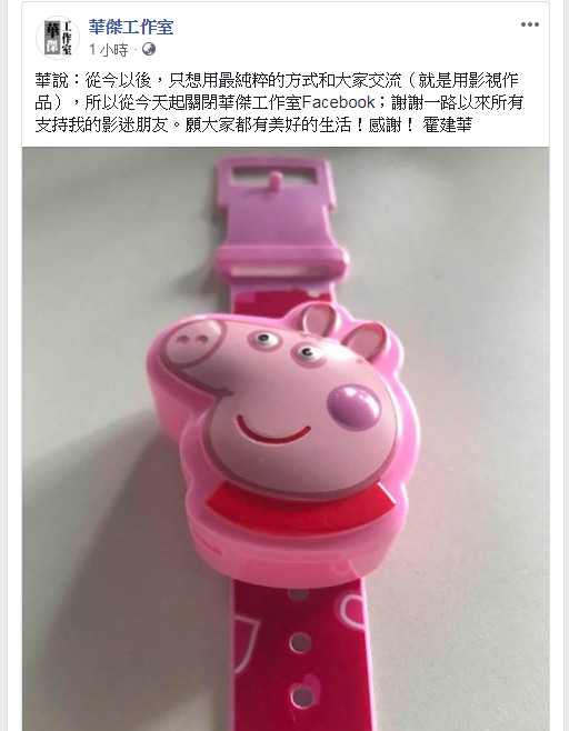不料,12日時霍建華的華傑工作室卻無預警的在微博和臉書同步宣布,即日起將關閉,幾乎全面性的退出網路平台,雖然工作室並沒有提到網軍的大量批評留言,不過許多粉絲紛紛猜測這便是要關版的原因。由於霍建華沒有個人的社群帳號,因此消息傳出後,讓許多粉絲們都相當崩潰,紛紛留言甚至擔心這是他即將引退演藝圈的前奏,但也有粉絲力挺偶像,希望他勇敢做自己。