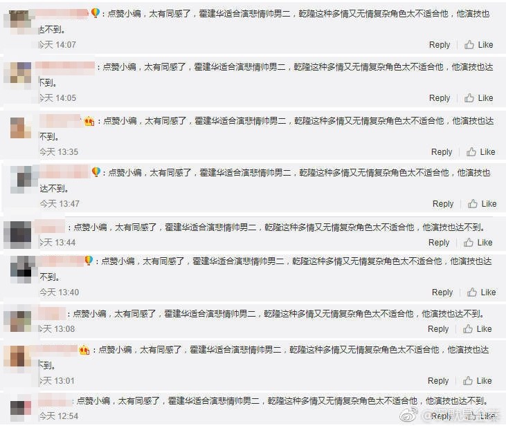 其中,男主角霍建華的演技常常被拿來與其他曾演過皇上的男星聶遠、陳建斌等人比較,近日,微博及臉書又瘋狂遭到網軍攻擊,不斷洗版留言批評他的演技,紛紛留言「霍建華帥,但這劇不行」、「點讚小編,太有同感了,霍建華適合演悲情帥男二,乾隆這種多情又無情複雜角色不適合他,他演技也達不到」質疑他的演技不到位。