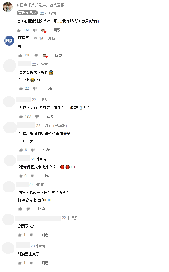 影片播出之後阿滴便在留言處打上:「嗯」,相當無言!黃氏兄弟的瑋瑋則在下方留言:「如果滴妹找哲哲,那.....我可以找阿滴嗎」,笑翻網友。而許多粉絲也紛紛激動留言表示:「滴妹直接搶走哲哲」、「太犯規了啦 怎麼可以牽手手」、「我真心覺得滴妹跟哲哲很配」、「完了,阿滴要爆發了!」、「阿滴:哪個人牽滴妹??!」。