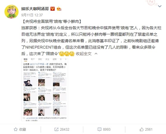 13日就傳出央視禁止「娘炮藝人」上節目,連小鮮肉的偶像藝人都慘遭列入禁邀名單,目前央視公佈的中秋晚會名單,僅剩楊坤、迪馬希、杜江、霍思燕、唐嫣等人,已不見當初原訂的人氣男團NINE PERCENT。